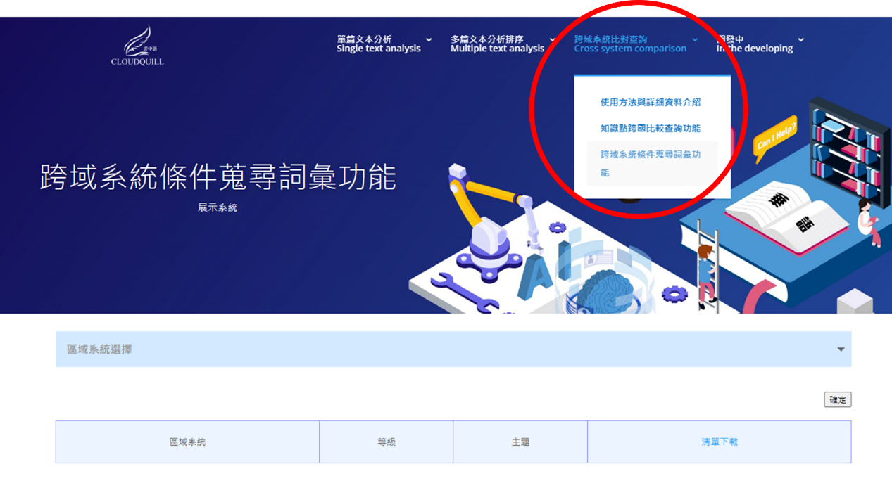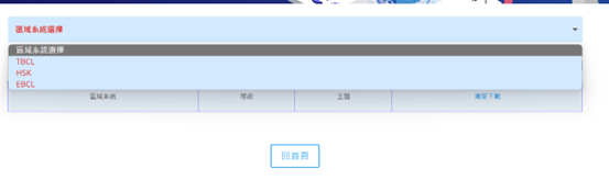 在進入「跨域系統條件蒐尋詞彙」介面後,即可選擇所欲蒐尋之區域系統:「TOCFL」、「HSK」或「EBCL,其選擇畫面如下所示: