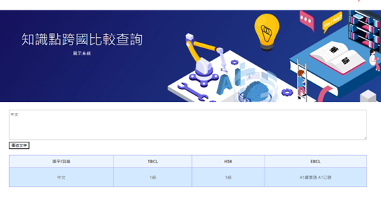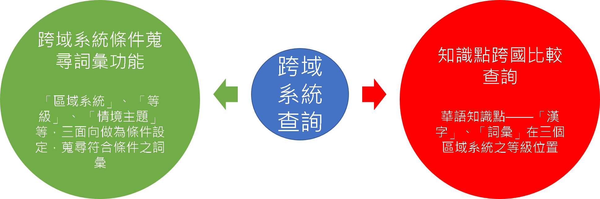 1. 語言的知識向度著手,了解語言知識向度中的特定知識點,如:特定漢字、詞彙在不同區域系統的等級位置,以有助於教師或學習者在面對跨域教學及學習時,判斷各知識點的能力位階——即「知識點跨國比較查詢」功能。