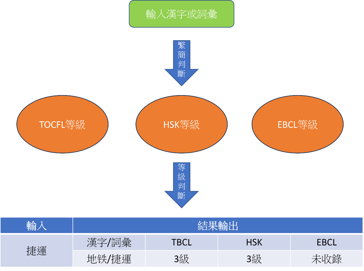 本功能之輸出結果以表格呈現,上圖表格中的第一格為查詢之漢字或詞彙,第二至四格即為該漢字/詞彙分別在TBCLHSKTBCL三個系統中的等級位置。