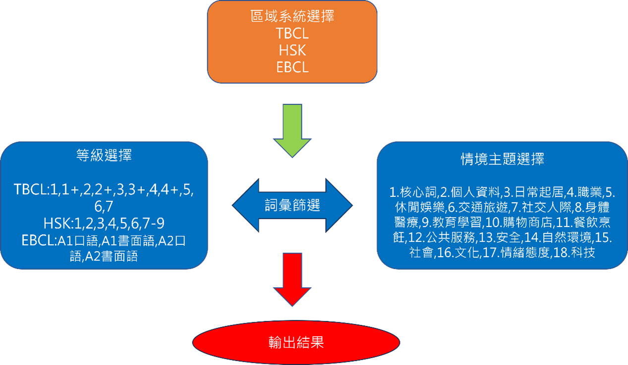 2. 使用者可以依需要,就區域、等級、情境主題三大面向加以設定,蒐尋符合所選區域、等級及情境(可複選)之詞彙群——即「跨域系統條件蒐尋詞彙」功能。