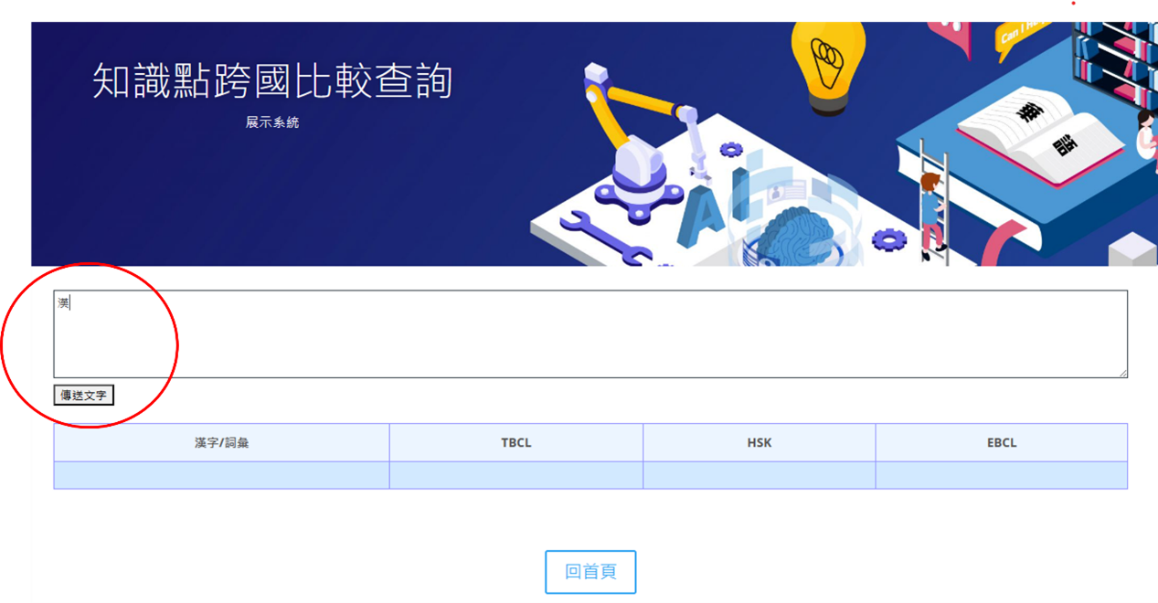 本功能操作方式相對簡易,在進入「知識點跨國比較查詢」介面後,即可在輸入方框中,輸入待查詢之漢字或詞彙,繁簡不拘,輸入完畢後按「傳送文字鈕」傳送,靜待1至數分鐘後即可在下方之表格看到查詢結果。