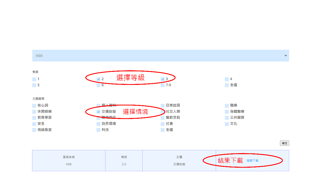 本功能主要是針對選擇的區域系統,就個別系統內部——等級、情境主題兩個維度進行條件設定,以篩選出符合等級及情境主題之詞彙。同時,貼近使用需求,本功能之等級及情境主題可以複選。例如:符合HSK區域系統中,第23級之「交通旅遊」情境主題之詞彙有: