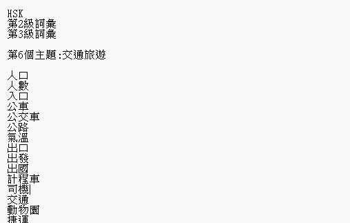 人口、人數、入口、公交車、公車、公路、氣溫、出口、出發、出國、計程車、司機、交通、動物園、捷運、地鐵……63個詞彙。